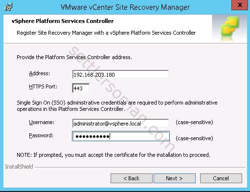 - Enter information about the vCenter Server instance at the site where you are installing Site Recovery Manager and click Next.